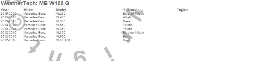 Below is an abbreviated list of applications for the All Weather Floor Mats.ML250, ML350, ML400, ML550, ML63 AMG, Mercedes-Benz, 2015, 2014, 2013, 2012
