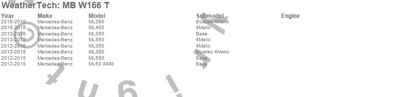 Below is an abbreviated list of applications for the All Weather Floor Mats.ML250, ML350, ML400, ML550, ML63 AMG, Mercedes-Benz, 2015, 2014, 2013, 2012