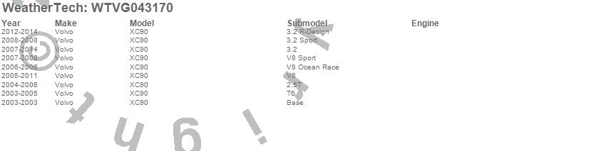 Below is an abbreviated list of applications for the All Weather Floor Mats.XC90, Volvo, 2014, 2013, 2012, 2011, 2010, 2009, 2008, 2007, 2006, 2005, 2004, 2003