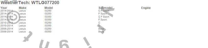 Below is an abbreviated list of applications for the All Weather Floor Mats.IS250, IS350, Lexus, 2014, 2013, 2012, 2011, 2010, 2009, 2008, 2007, 2006