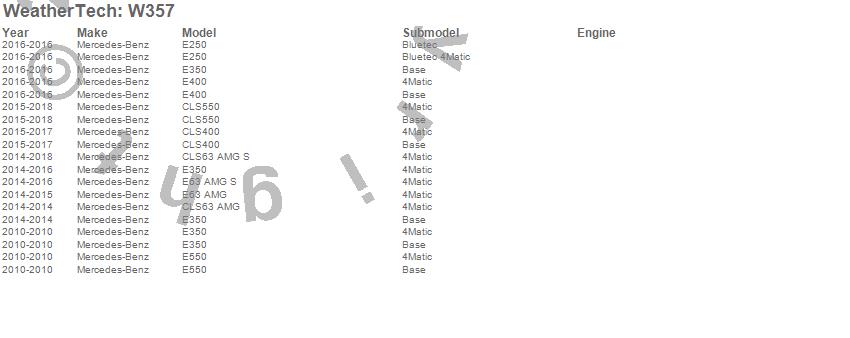 Below is an abbreviated list of applications for the All Weather Floor Mats.CLS400, CLS550, CLS63 AMG, CLS63 AMG S, E250, E350, E400, E550, E63 AMG, E63 AMG S, Mercedes-Benz, 2018, 2017, 2016, 2015, 2014, 2010
