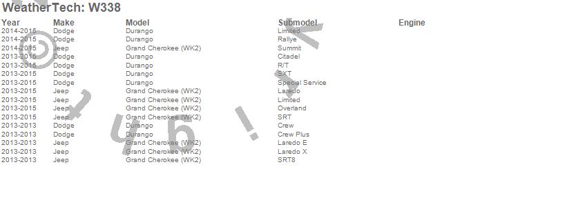Below is an abbreviated list of applications for the All Weather Floor Mats.Durango, Grand Cherokee (WK2), Dodge, Jeep, 2015, 2014, 2013