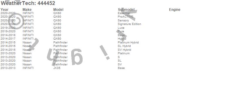 Below is an abbreviated list of applications for the FloorLiner DigitalFit.JX35, Pathfinder, QX60, INFINITI, Nissan, 2020, 2019, 2018, 2017, 2016, 2015, 2014, 2013