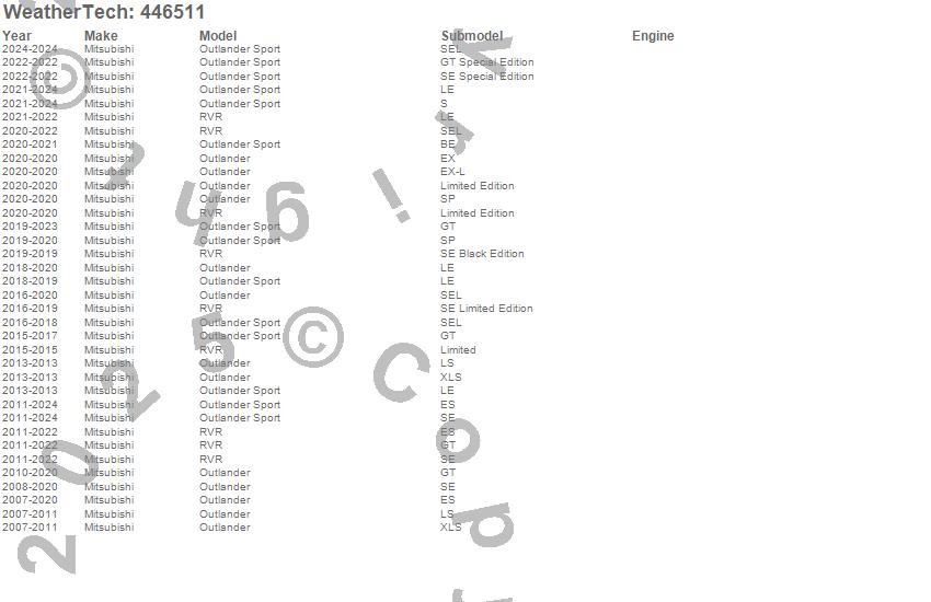 Below is an abbreviated list of applications for the FloorLiner DigitalFit.Outlander, Outlander Sport, RVR, Mitsubishi, 2024, 2023, 2022, 2021, 2020, 2019, 2018, 2017, 2016, 2015, 2014, 2013, 2012, 2011, 2010, 2009