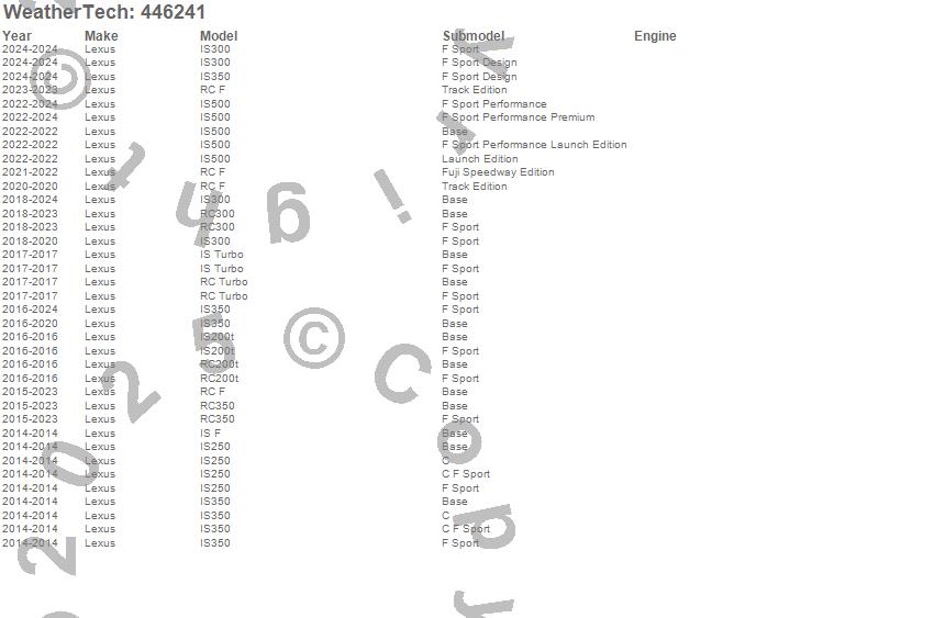 Below is an abbreviated list of applications for the FloorLiner DigitalFit.IS F, IS Turbo, IS200t, IS250, IS300, IS350, IS500, RC F, RC Turbo, RC200t, RC300, RC350, Lexus, 2024, 2023, 2022, 2021, 2020, 2019, 2018