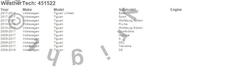 Below is an abbreviated list of applications for the FloorLiner DigitalFit.Tiguan, Tiguan Limited, Volkswagen, 2018, 2017, 2016, 2015, 2014, 2013, 2012, 2011, 2010, 2009