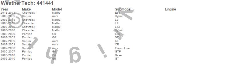 Below is an abbreviated list of applications for the FloorLiner DigitalFit.Aura, G6, Malibu, Chevrolet, Pontiac, Saturn, 2013, 2012, 2011, 2010, 2009, 2008, 2007, 2006, 2005