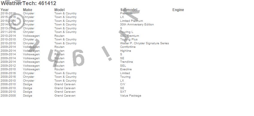 Below is an abbreviated list of applications for the FloorLiner DigitalFit.Grand Caravan, Routan, Town & Country, Chrysler, Dodge, Volkswagen, 2016, 2015, 2014, 2013, 2012, 2011, 2010, 2009, 2008