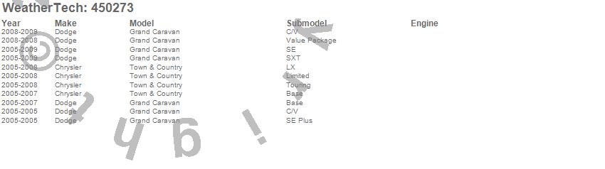 Below is an abbreviated list of applications for the FloorLiner DigitalFit.Grand Caravan, Town & Country, Chrysler, Dodge, 2009, 2008, 2007, 2006, 2005
