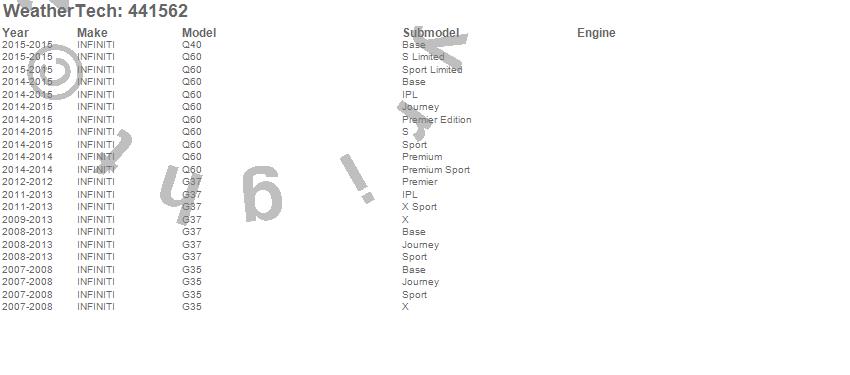 Below is an abbreviated list of applications for the FloorLiner DigitalFit.G35, G37, Q40, Q60, INFINITI, 2015, 2014, 2013, 2012, 2011, 2010, 2009, 2008, 2007