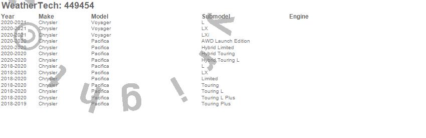 Below is an abbreviated list of applications for the FloorLiner DigitalFit.Pacifica, Voyager, Chrysler, 2021, 2020, 2019, 2018