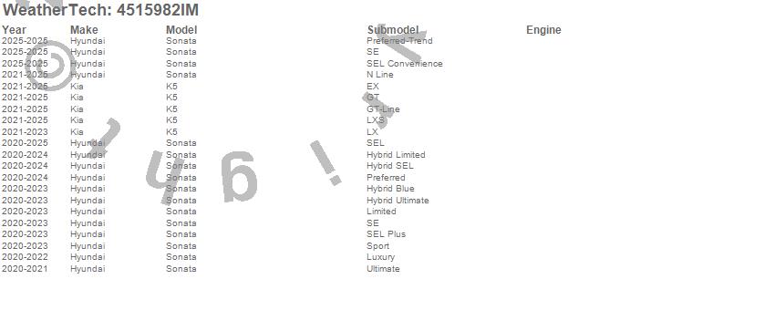 Below is an abbreviated list of applications for the FloorLiner HP.K5, Sonata, Hyundai, Kia, 2026, 2025, 2024, 2023, 2022, 2021, 2020