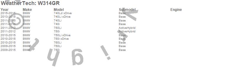 Below is an abbreviated list of applications for the All Weather Floor Mats.740i, 740Ld xDrive, 740Li, 740Li xDrive, 750i, 750i xDrive, 750Li, 750Li xDrive, 760Li, BMW, 2015, 2014, 2013, 2012, 2011, 2010, 2009
