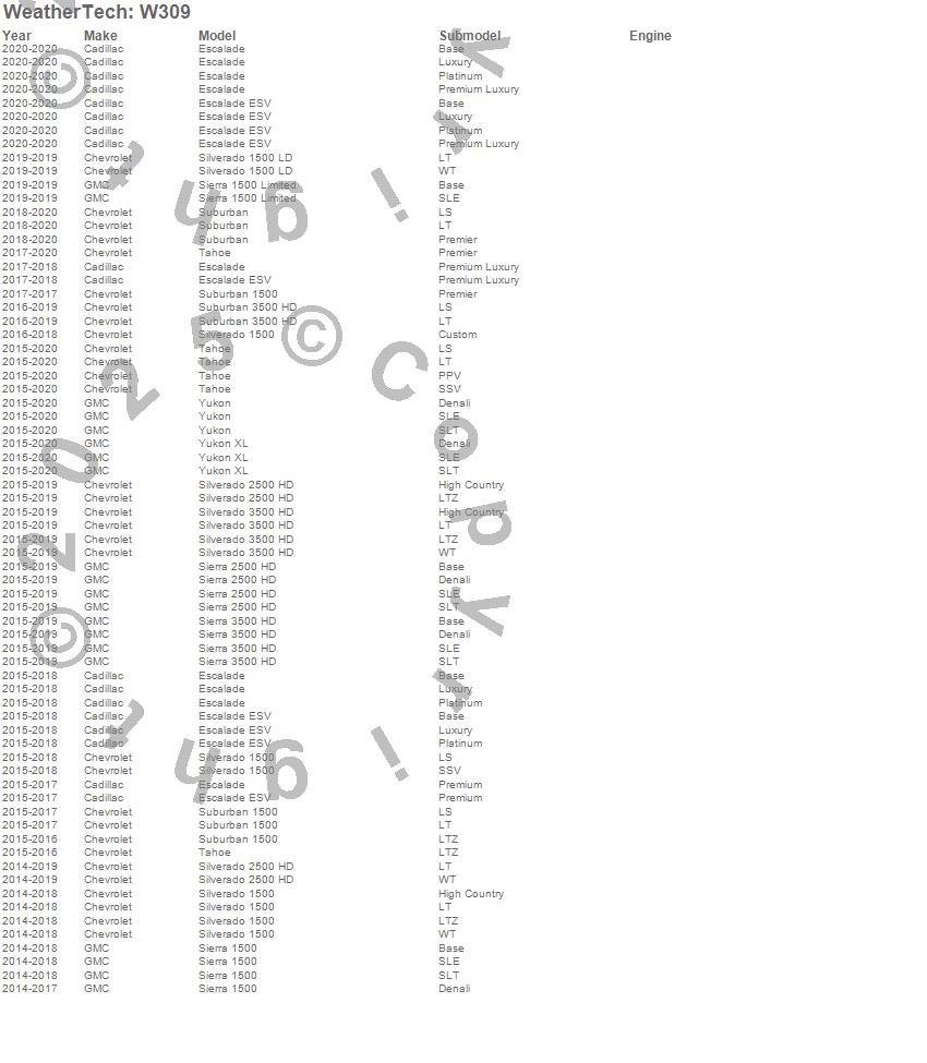 Below is an abbreviated list of applications for the All Weather Floor Mats.Escalade, Escalade ESV, Sierra 1500, Sierra 1500 Limited, Sierra 2500 HD, Sierra 3500 HD, Silverado 1500, Silverado 1500 LD, Silverado 2500 HD, Silverado 3500 HD, Suburban, Suburban 1500, Suburban 3500 HD, Tahoe, Yukon, Yukon XL, Cadillac, Chevrolet, GMC, 2020