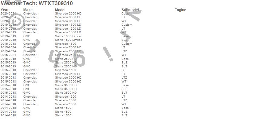 Below is an abbreviated list of applications for the All Weather Floor Mats.Sierra 1500, Sierra 1500 Limited, Sierra 2500 HD, Sierra 3500 HD, Silverado 1500, Silverado 1500 LD, Silverado 2500 HD, Silverado 3500 HD, Chevrolet, GMC, 2024, 2023, 2022, 2021, 2020, 2019, 2018, 2017, 2016, 2015