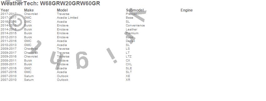 Below is an abbreviated list of applications for the All Weather Floor Mats.Acadia, Acadia Limited, Enclave, Outlook, Traverse, Buick, Chevrolet, GMC, Saturn, 2017, 2016, 2015, 2014, 2013, 2012, 2011, 2010, 2009, 2008, 2007