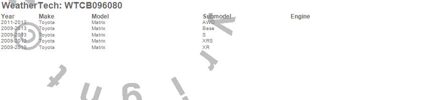 Below is an abbreviated list of applications for the All Weather Floor Mats.Matrix, Toyota, 2013, 2012, 2011, 2010, 2009