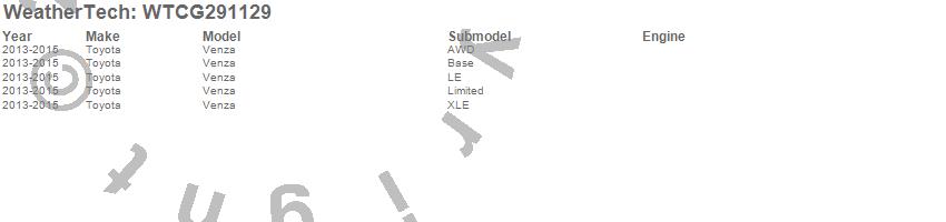 Below is an abbreviated list of applications for the All Weather Floor Mats.Venza, Toyota, 2015, 2014, 2013