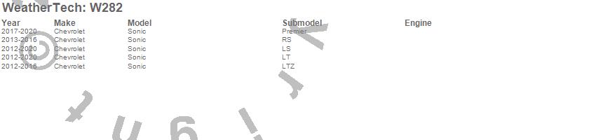 Below is an abbreviated list of applications for the All Weather Floor Mats.Sonic, Chevrolet, 2020, 2019, 2018, 2017, 2016, 2015, 2014, 2013, 2012