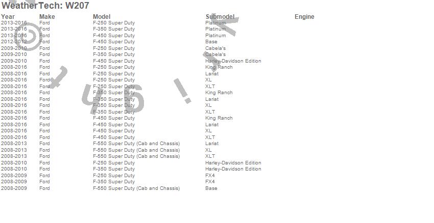 Below is an abbreviated list of applications for the All Weather Floor Mats.F-250 Super Duty, F-350 Super Duty, F-450 Super Duty, F-550 Super Duty, Ford, 2016, 2015, 2014, 2013, 2012, 2011, 2010, 2009, 2008
