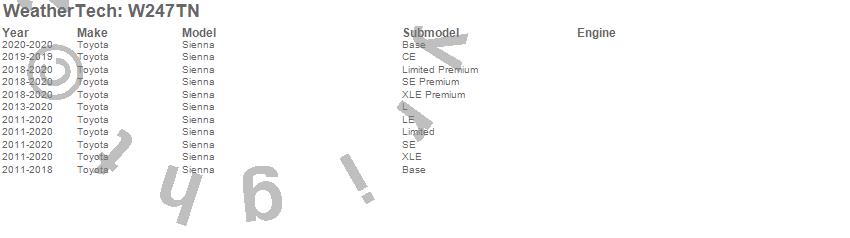 Below is an abbreviated list of applications for the All Weather Floor Mats.Sienna, Toyota, 2020, 2019, 2018, 2017, 2016, 2015, 2014, 2013, 2012, 2011