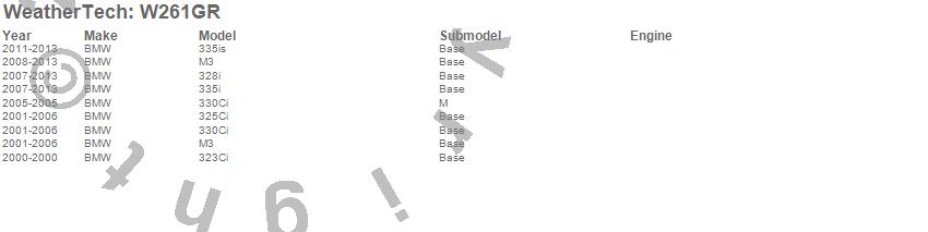 Below is an abbreviated list of applications for the All Weather Floor Mats.323Ci, 325Ci, 328i, 330Ci, 335i, 335is, M3, BMW, 2013, 2012, 2011, 2010, 2009, 2008, 2007, 2006, 2005, 2004, 2003, 2002