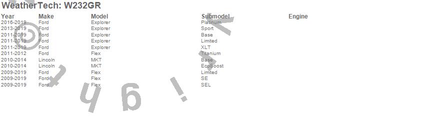 Below is an abbreviated list of applications for the All Weather Floor Mats.Explorer, Flex, MKT, Ford, Lincoln, 2019, 2018, 2017, 2016, 2015, 2014, 2013, 2012, 2011, 2010, 2009
