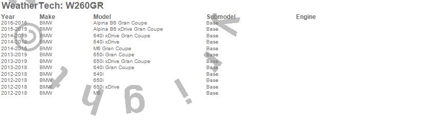 Below is an abbreviated list of applications for the All Weather Floor Mats.640i, 640i Gran Coupe, 640i xDrive, 640i xDrive Gran Coupe, 650i, 650i Gran Coupe, 650i xDrive, 650i xDrive Gran Coupe, Alpina B6 Gran Coupe, Alpina B6 xDrive Gran Coupe, M6, M6 Gran Coupe, BMW, 2019, 2018, 2017, 2016, 2015, 2014, 2013