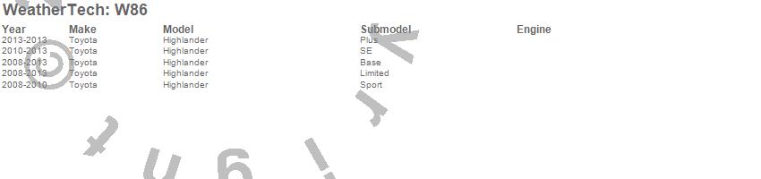 Below is an abbreviated list of applications for the All Weather Floor Mats.Highlander, Toyota, 2013, 2012, 2011, 2010, 2009, 2008