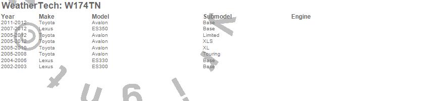 Below is an abbreviated list of applications for the All Weather Floor Mats.Avalon, ES300, ES330, ES350, Lexus, Toyota, 2012, 2011, 2010, 2009, 2008, 2007, 2006, 2005, 2004, 2003, 2002