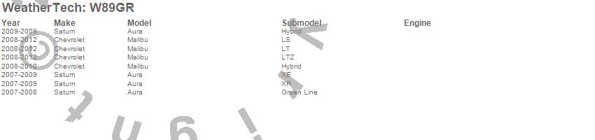 Below is an abbreviated list of applications for the All Weather Floor Mats.Aura, Malibu, Chevrolet, Saturn, 2012, 2011, 2010, 2009, 2008, 2007