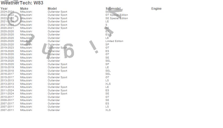 Below is an abbreviated list of applications for the All Weather Floor Mats.Outlander, Outlander Sport, Mitsubishi, 2024, 2023, 2022, 2021, 2020, 2019, 2018, 2017, 2016, 2015, 2014, 2013, 2012, 2011, 2010, 2009, 2008