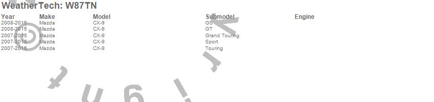 Below is an abbreviated list of applications for the All Weather Floor Mats.CX-9, Mazda, 2015, 2014, 2013, 2012, 2011, 2010, 2009, 2008, 2007