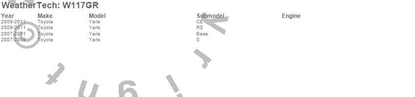 Below is an abbreviated list of applications for the All Weather Floor Mats.Yaris, Toyota, 2011, 2010, 2009, 2008, 2007