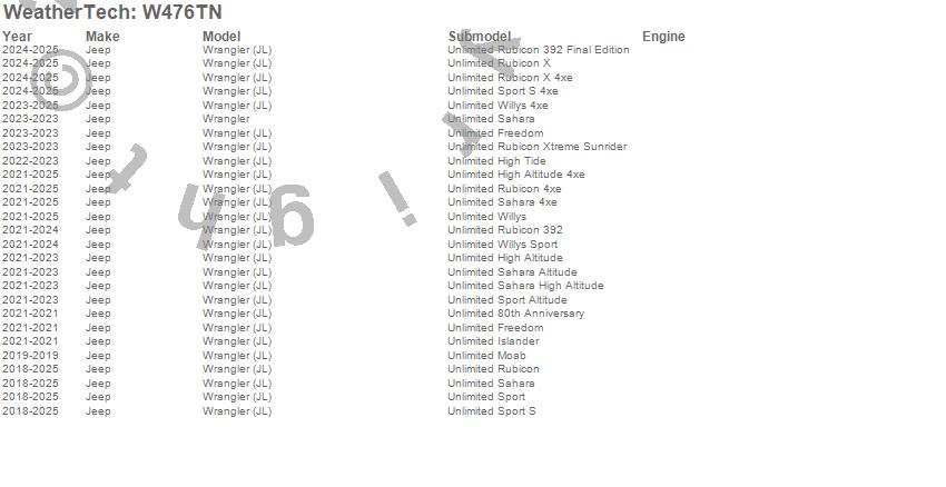 Below is an abbreviated list of applications for the All Weather Floor Mats.Wrangler, Wrangler (JL), Jeep, 2025, 2024, 2023, 2022, 2021, 2020, 2019, 2018