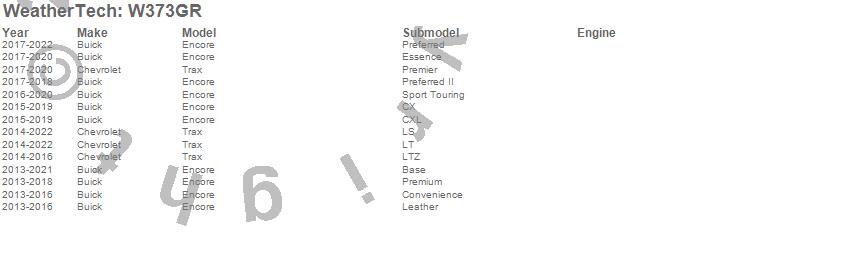 Below is an abbreviated list of applications for the All Weather Floor Mats.Encore, Trax, Buick, Chevrolet, 2022, 2021, 2020, 2019, 2018, 2017, 2016, 2015, 2014, 2013