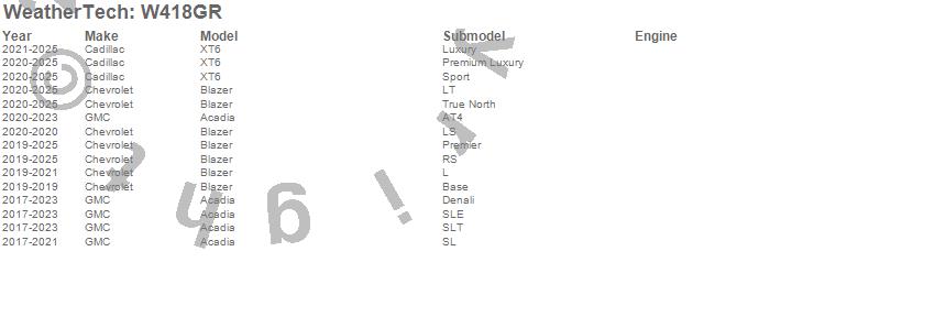 Below is an abbreviated list of applications for the All Weather Floor Mats.Acadia, Blazer, XT6, Cadillac, Chevrolet, GMC, 2026, 2025, 2024, 2023, 2022, 2021, 2020, 2019, 2018, 2017