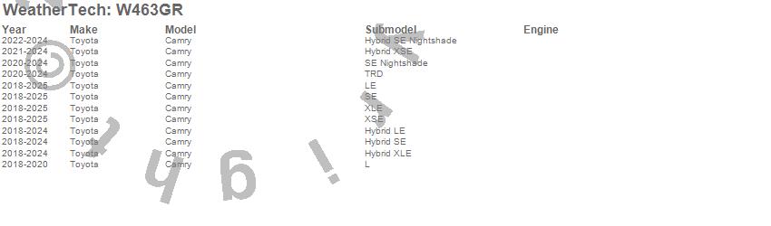 Below is an abbreviated list of applications for the All Weather Floor Mats.Camry, Toyota, 2026, 2025, 2024, 2023, 2022, 2021, 2020, 2019, 2018