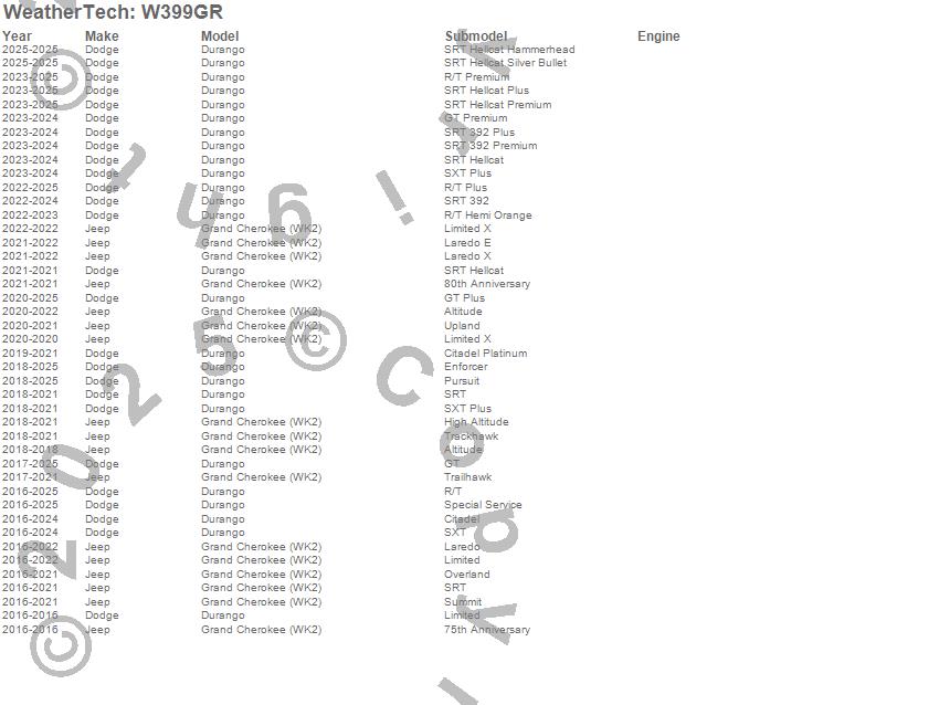 Below is an abbreviated list of applications for the All Weather Floor Mats.Durango, Grand Cherokee (WK2), Dodge, Jeep, 2026, 2025, 2024, 2023, 2022, 2021, 2020, 2019, 2018, 2017, 2016