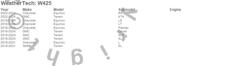 Below is an abbreviated list of applications for the All Weather Floor Mats.Equinox, Terrain, Chevrolet, GMC, 2026, 2025, 2024, 2023, 2022, 2021, 2020, 2019, 2018