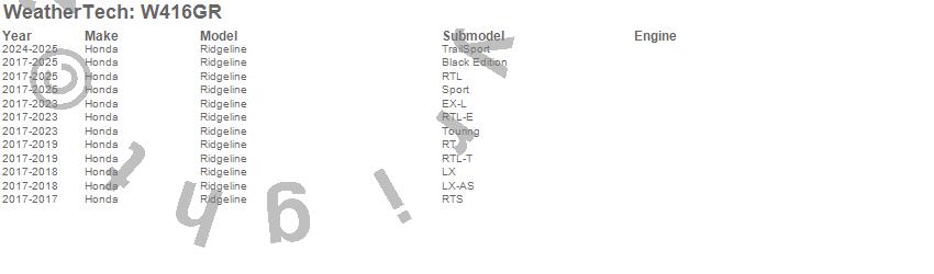 Below is an abbreviated list of applications for the All Weather Floor Mats.Ridgeline, Honda, 2026, 2025, 2024, 2023, 2022, 2021, 2020, 2019, 2018, 2017