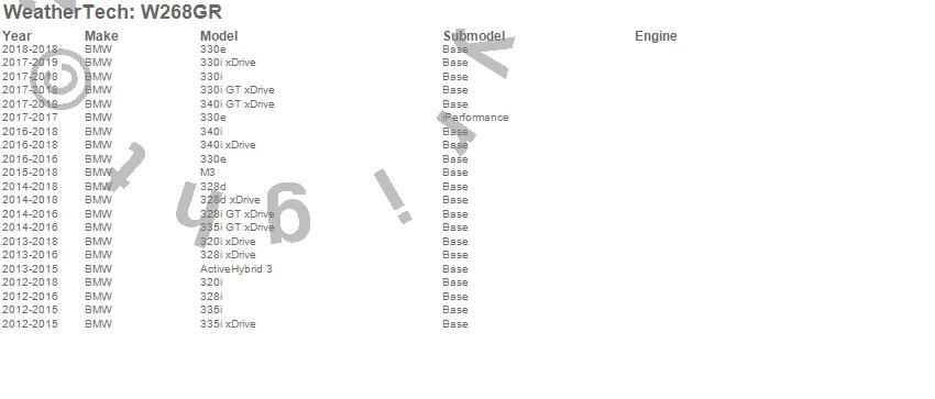 Below is an abbreviated list of applications for the All Weather Floor Mats.320i, 320i xDrive, 328d, 328d xDrive, 328i, 328i GT xDrive, 328i xDrive, 330e, 330i xDrive, 335i, 335i GT xDrive, 335i xDrive, 340i, 340i GT xDrive, 340i xDrive, ActiveHybrid 3, M3, BMW, 2019, 2018