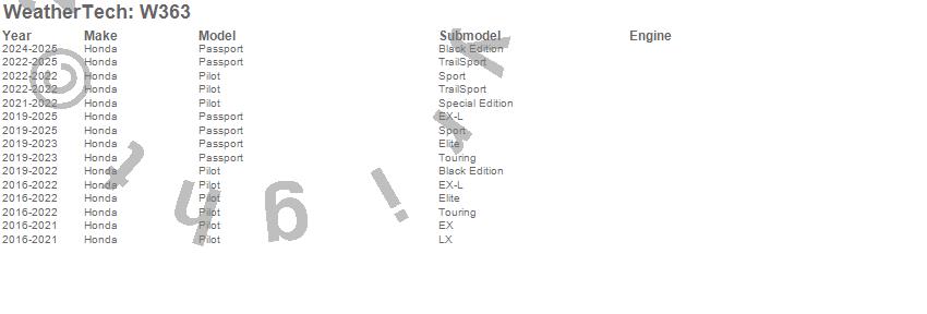 Below is an abbreviated list of applications for the All Weather Floor Mats.Passport, Pilot, Honda, 2025, 2024, 2023, 2022, 2021, 2020, 2019, 2018, 2017, 2016