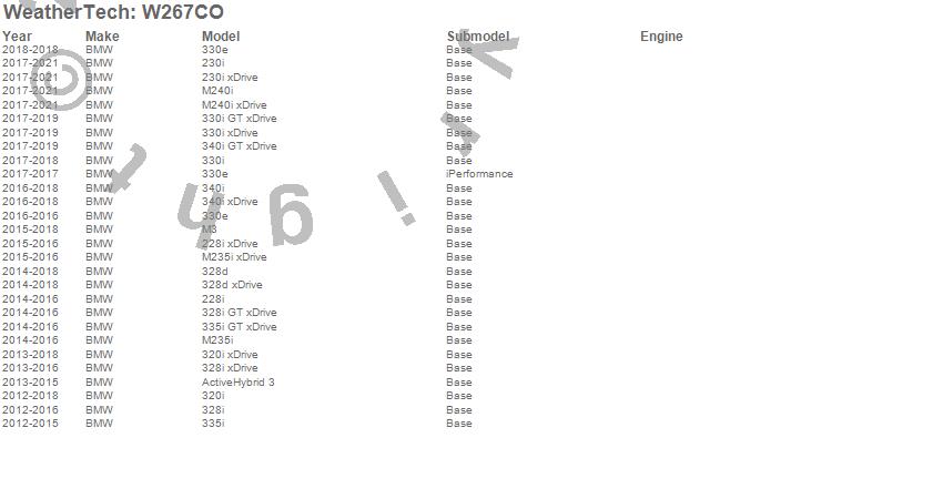 Below is an abbreviated list of applications for the All Weather Floor Mats.228i, 228i xDrive, 230i, 230i xDrive, 320i, 320i xDrive, 328d, 328d xDrive, 328i, 328i GT xDrive, 328i xDrive, 330e, 330i xDrive, 335i, 335i GT xDrive, 340i, 340i GT xDrive, 340i xDrive, ActiveHybrid 3, M235i