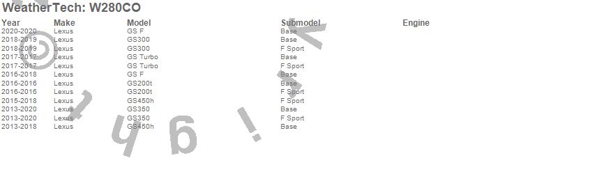 Below is an abbreviated list of applications for the All Weather Floor Mats.GS F, GS Turbo, GS200t, GS300, GS350, GS450h, Lexus, 2020, 2019, 2018, 2017, 2016, 2015, 2014, 2013
