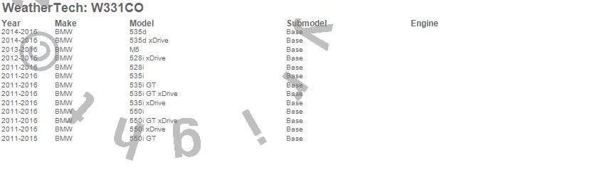Below is an abbreviated list of applications for the All Weather Floor Mats.528i, 528i xDrive, 535d, 535d xDrive, 535i, 535i GT, 535i GT xDrive, 535i xDrive, 550i, 550i GT, 550i GT xDrive, 550i xDrive, M5, BMW, 2016, 2015, 2014, 2013, 2012, 2011
