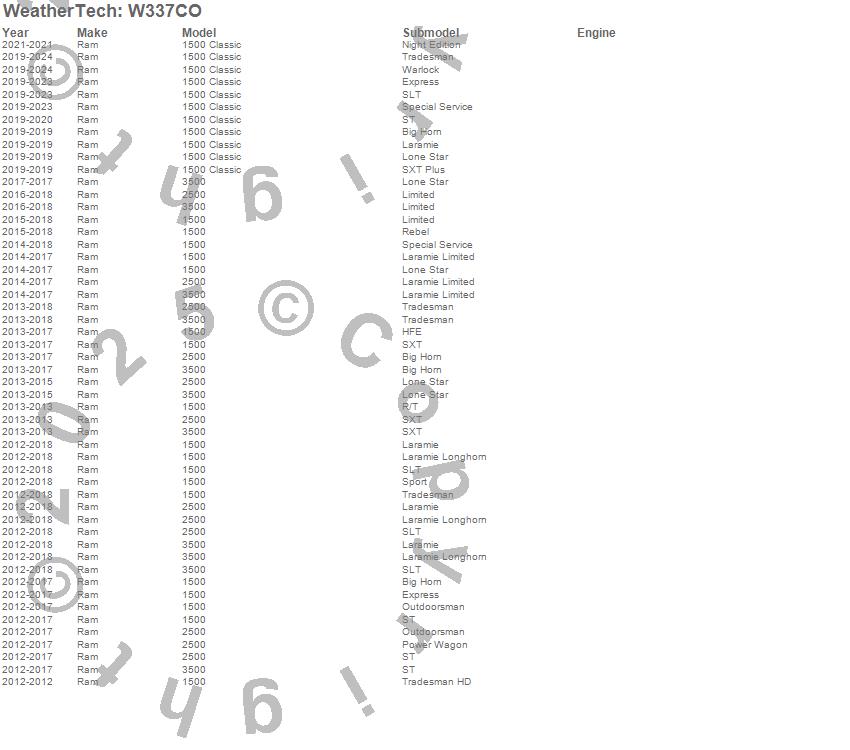 Below is an abbreviated list of applications for the All Weather Floor Mats.1500, 1500 Classic, 2500, 3500, Ram, 2024, 2023, 2022, 2021, 2020, 2019, 2018, 2017, 2016, 2015, 2014, 2013, 2012