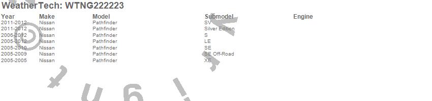 Below is an abbreviated list of applications for the All Weather Floor Mats.Pathfinder, Nissan, 2012, 2011, 2010, 2009, 2008, 2007, 2006, 2005