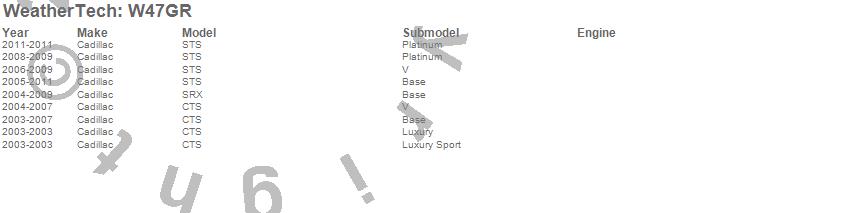 Below is an abbreviated list of applications for the All Weather Floor Mats.CTS, SRX, STS, Cadillac, 2011, 2010, 2009, 2008, 2007, 2006, 2005, 2004, 2003