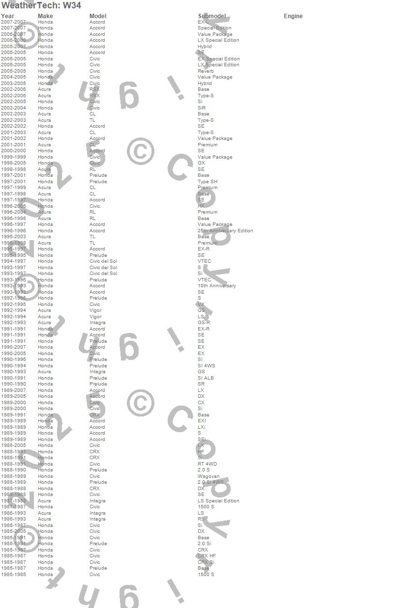 Below is an abbreviated list of applications for the All Weather Floor Mats.Accord, Civic, Civic del Sol, CL, CRX, Integra, Prelude, RL, RSX, TL, Vigor, Acura, Honda, 2007, 2006, 2005, 2004, 2003, 2002, 2001